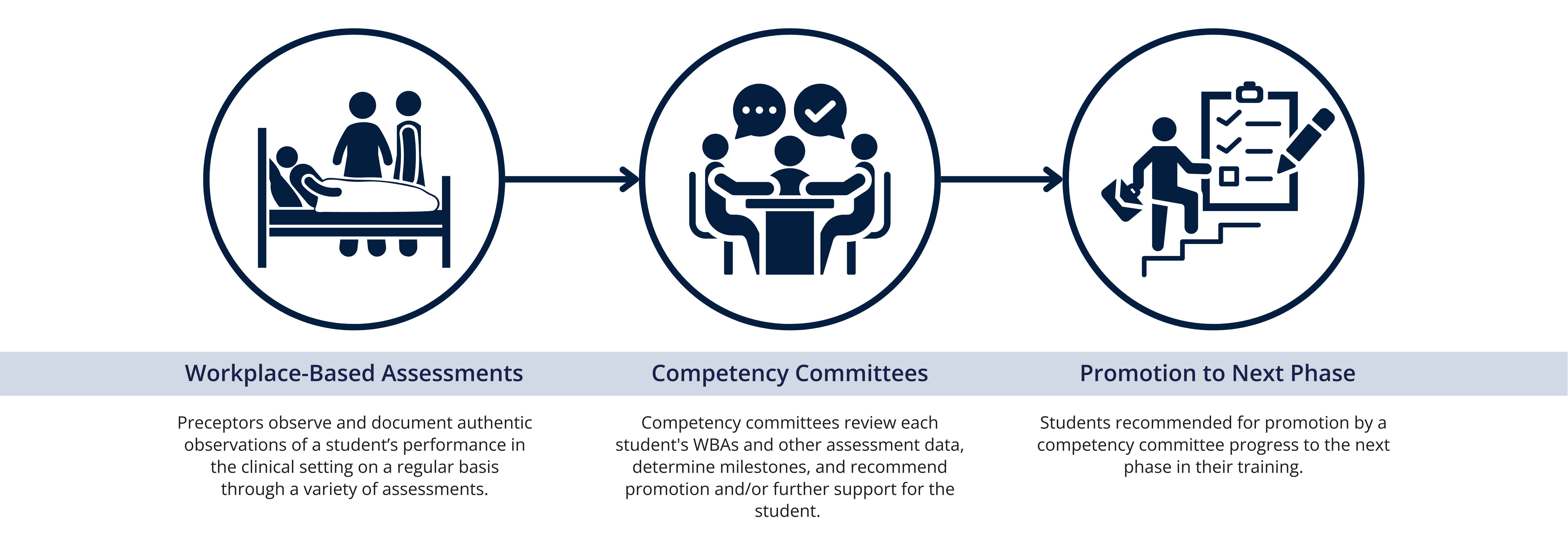 CCCs review aggregated evidence of student performance, including WBAs, clerkship rating items, and other relevant data, to determine whether students are meeting expected milestones for their phase of training. Decisions are based on patterns of performance over time rather than single observations.