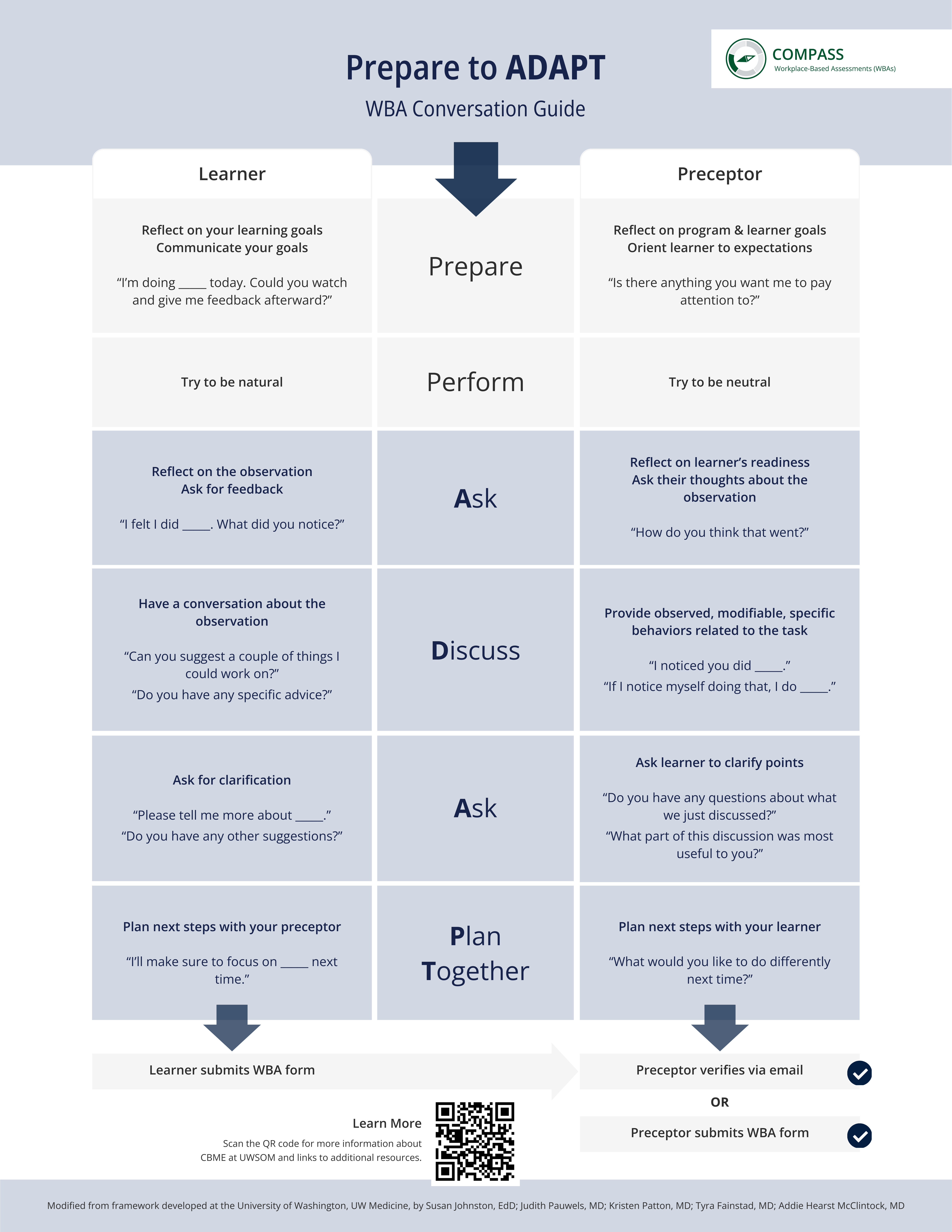 - WBA Conversation Guide: A quick reference guide for completing WBAs using the Prepare to ADAPT framework for asking for, receiving, and providing feedback in the clinical learning environment.